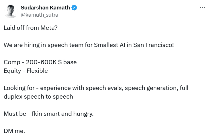 Enquanto isso, a startup Smallest AI, de São Francisco, enxergou uma oportunidade: abriu um convite público para contratar os demitidos. O fundador, Sudarshan Kamath, anunciou nas redes sociais que busca ex-funcionários da Meta para integrar sua equipe.